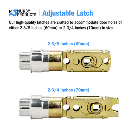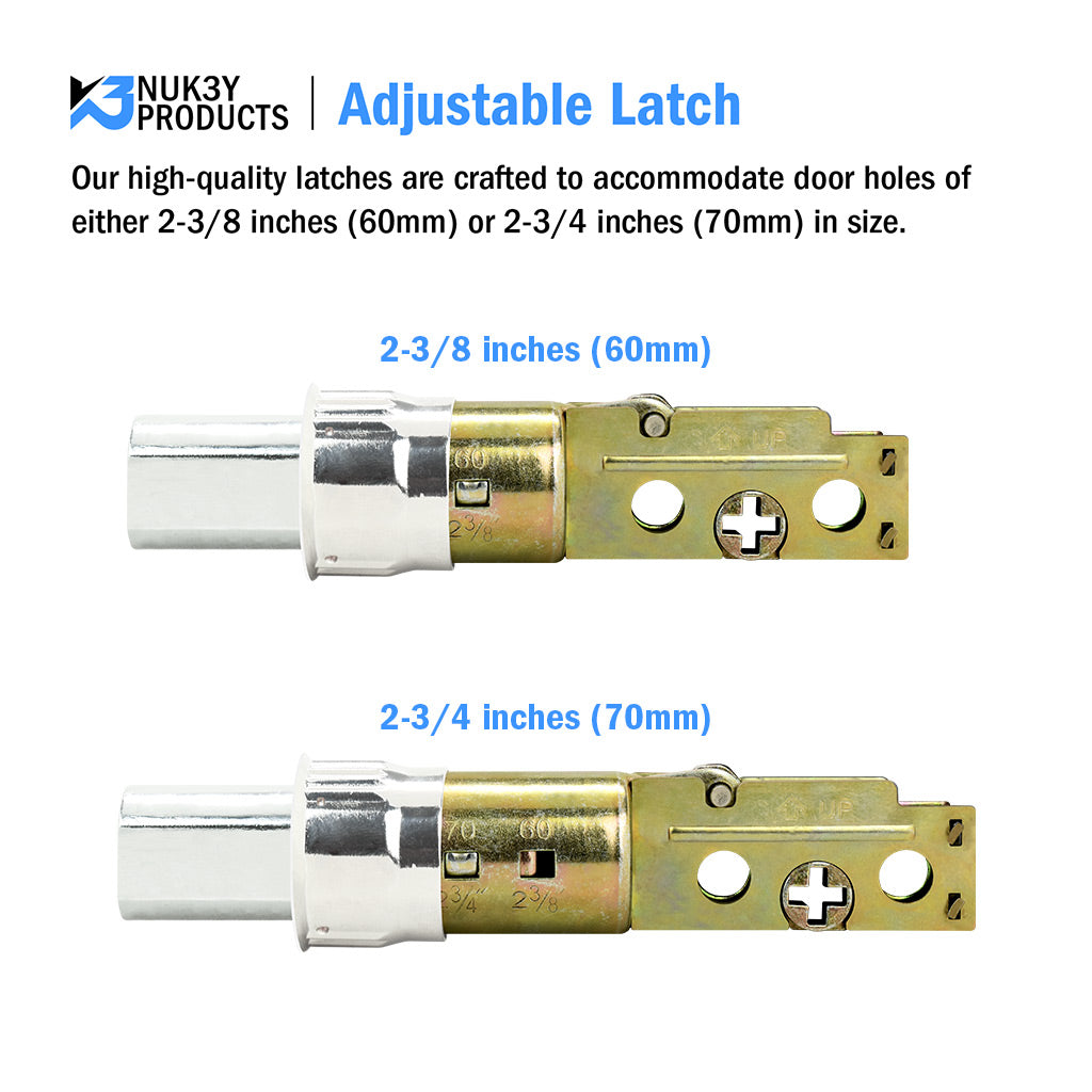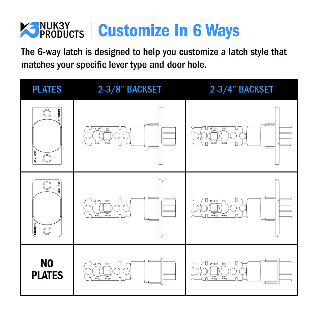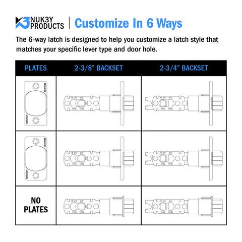 - "6-WAY twist action latch to fit all type of doors with 2-3/8 inch and 2-3/4 inch backset. This includes drive in, square, and round corner faceplate."